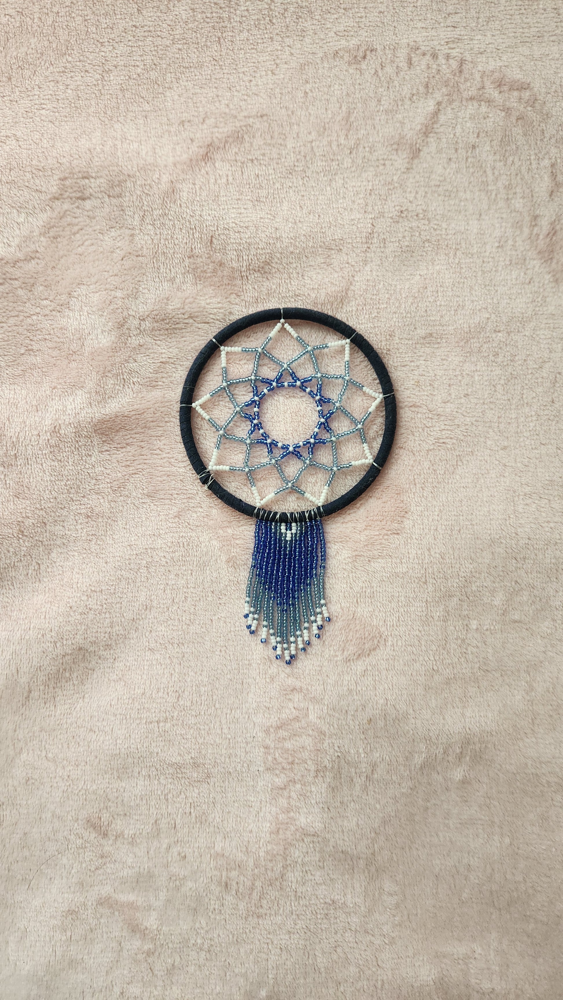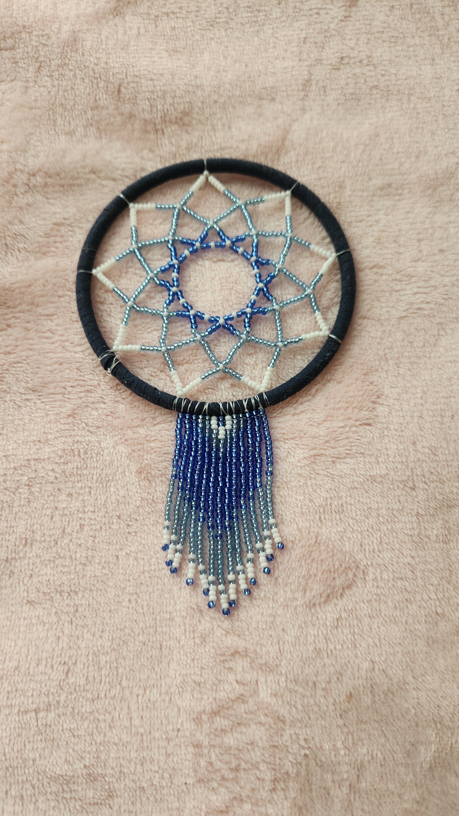 Dreamcatcher made with the best of intentions. Wrapped with faux leather in a navy blue colour, and adorned with blue and white beads in a traditional webbed pattern. Mini fringe hanging from the bottom. Ring is approximately 3.5 inches in width. Comes with a stretchy tie at the top (removable).
