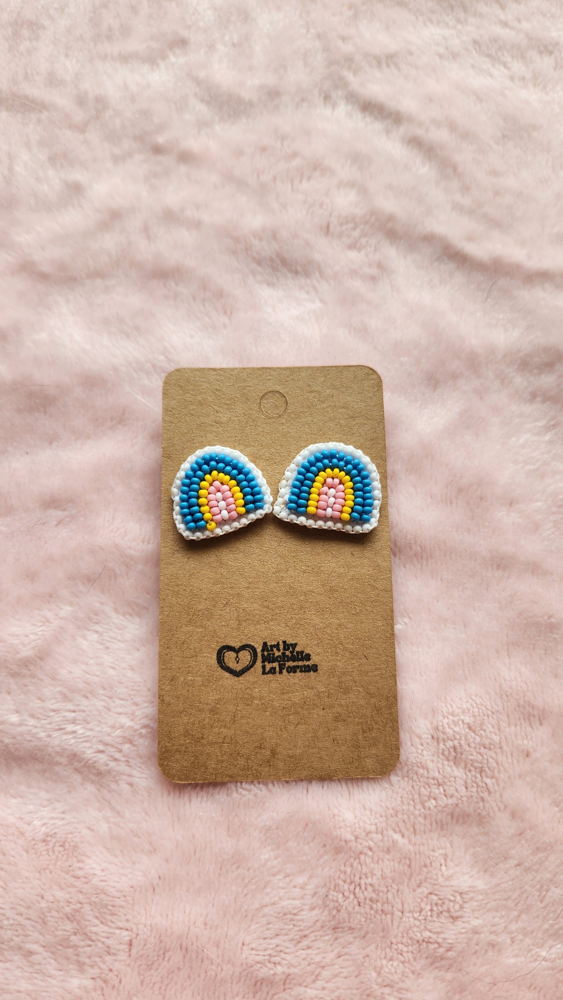Small stud earrings, fully beaded in colours that represent your favourite childhood cereal! Made with size 11/0 seed beads with a stud finding and backed with faux leather. Rainbows that are sure to add more colour to any outfit.
