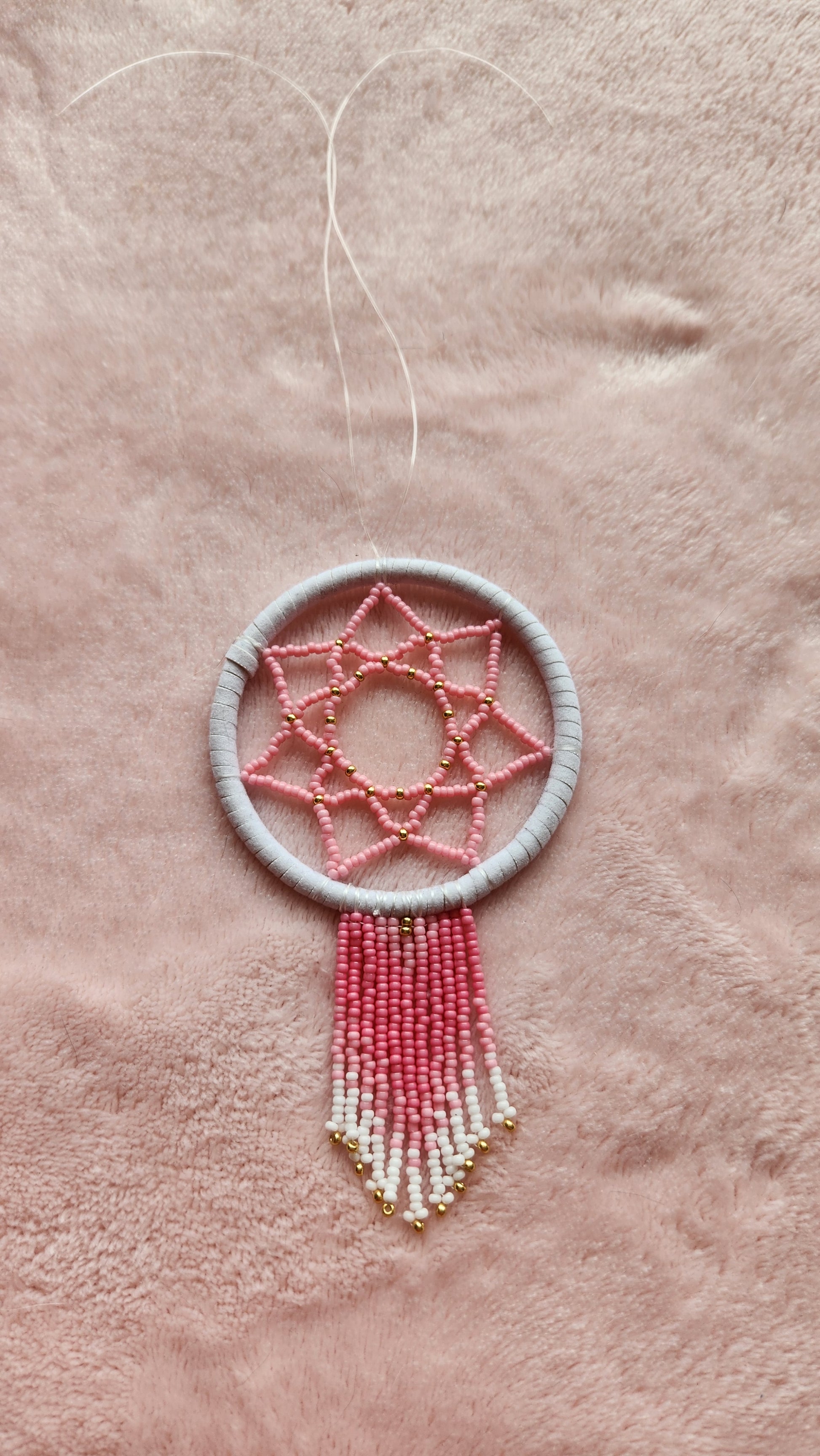 Dreamcatcher made with the best of intentions. Wrapped with faux leather in a cream colour, and adorned with pink, gold and white beads in a traditional webbed pattern. Mini fringe hanging from the bottom. Ring is approximately 2.5 inches in width. Comes with a stretchy tie at the top (removable). The perfect size to hang from your rearview mirror.